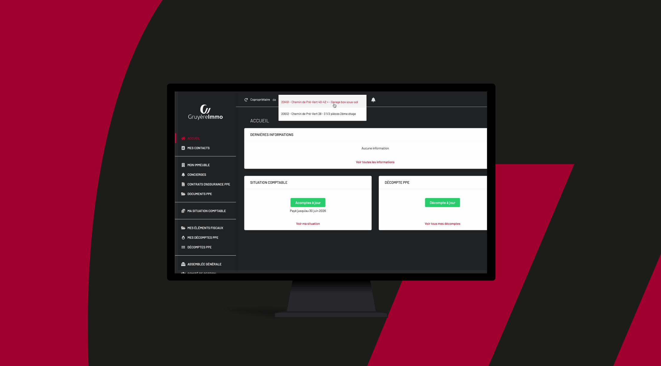 Ce portail permet à chaque copropriétaire de consulter l’ensemble des données liées à leur PPE : décomptes individuels, documents fiscaux, convocations, PV d’assemblées et bien plus encore. En un seul endroit, ils gardent une vision claire de leur situation et retrouvent rapidement tous les fichiers importants.
